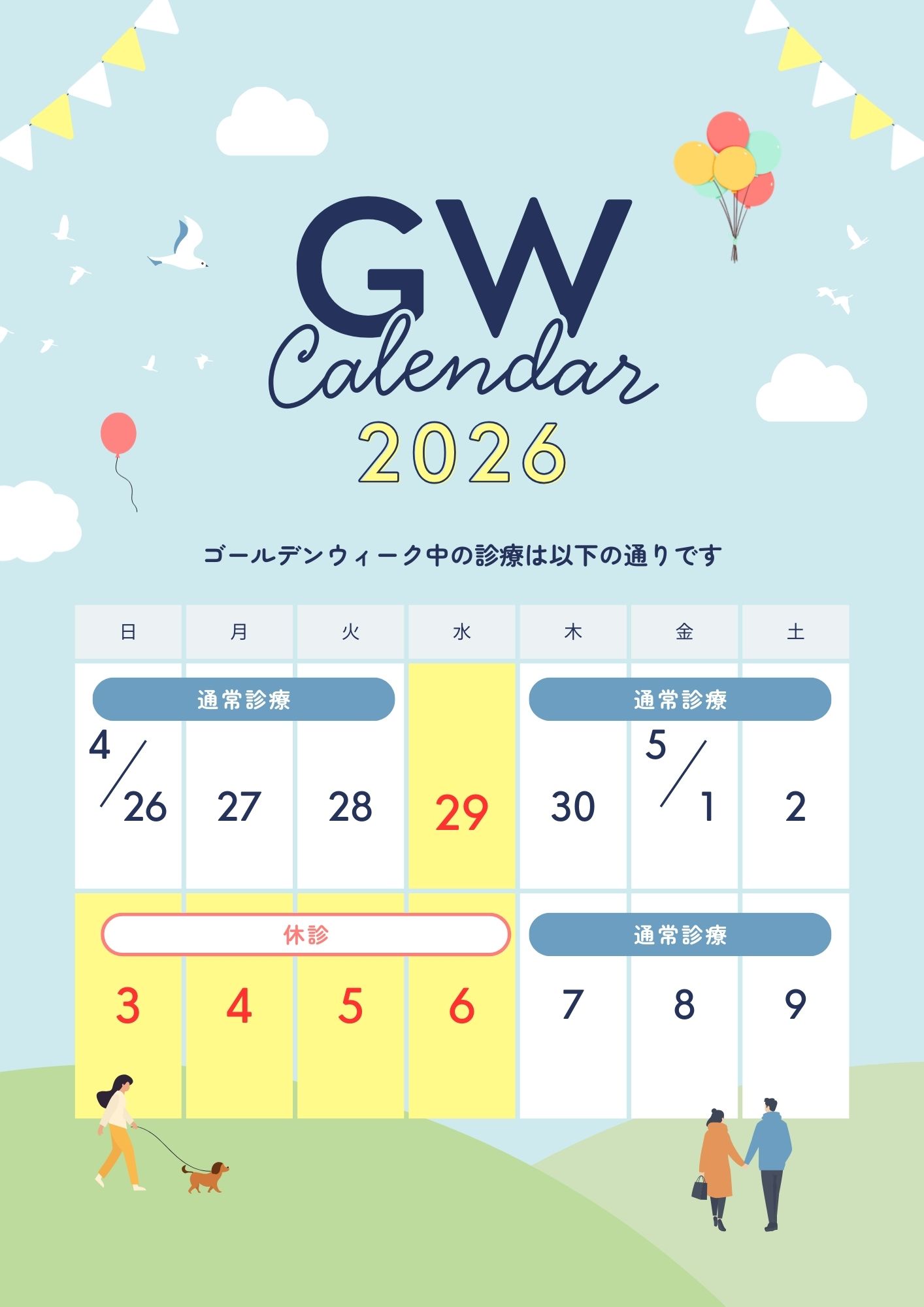 いつも佐野クリニックをご利用いただき、誠にありがとうございます。ゴールデンウィークの休診日について、以下の通りご案内申し上げます。休診日: - 2026年5月3日(日)から2026年5月6日(水)まで5月初旬に定期通院をご予定されている方は、ご確認お願い致します。休診期間中はご不便をおかけいたしますが、ご理解とご協力のほどよろしくお願いいたします。5月7日より、引き続き皆様の健康をサポートできますよう努めてまいります。